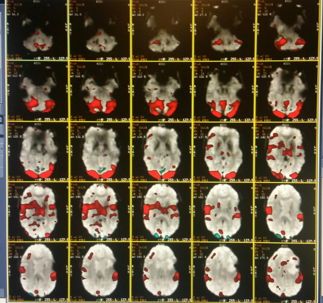 I've shared my normal brain scan before. This is my brain when I move my hands, move my tongue and listen to and think of names of objects.